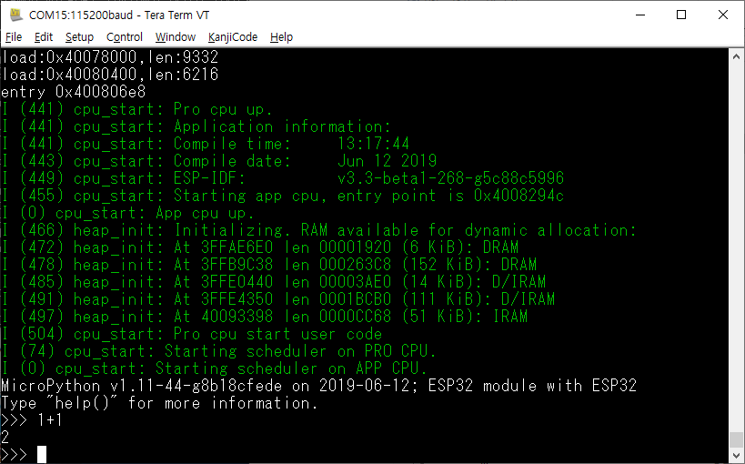 > esptool.py --chip esp32 --port COM15 --baud 460800 write_flash -z 0x1000 esp32-20190612-v1.11-44-g8b18cfede.bin
